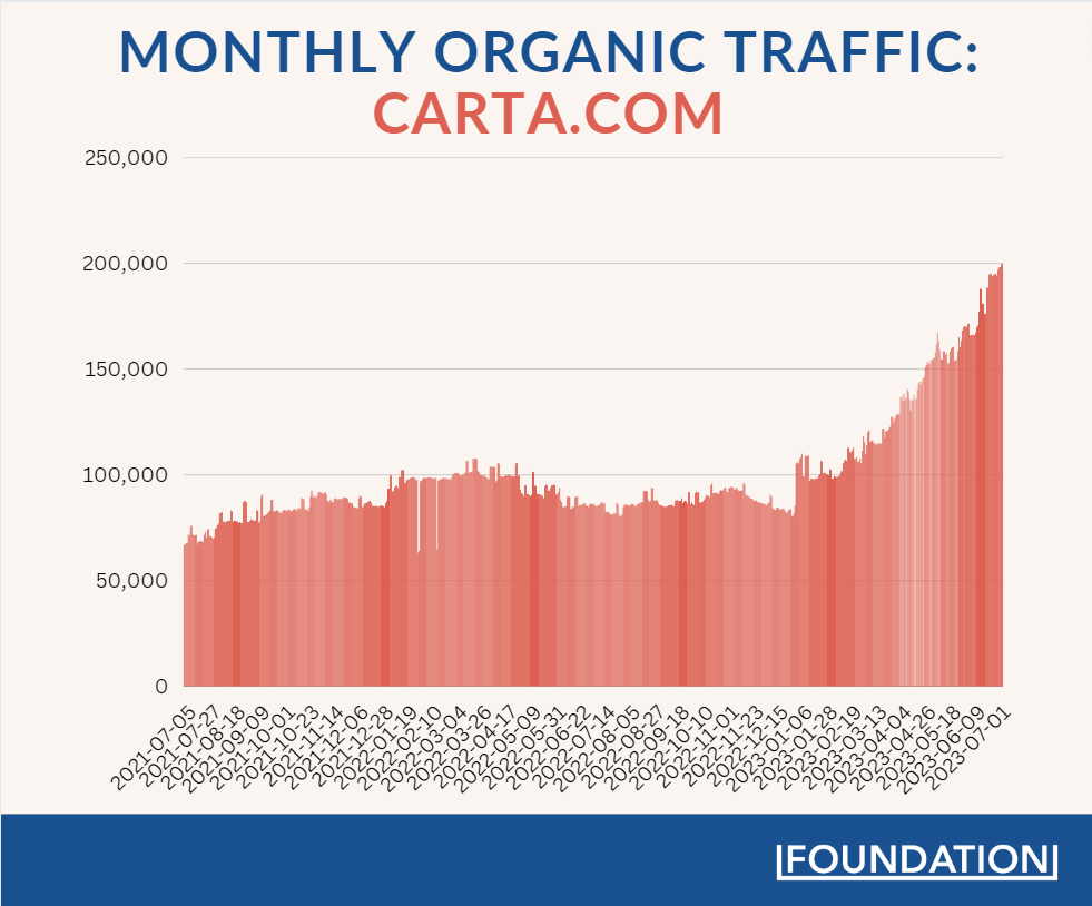 Over the first six months of 2023, Carta’s organic traffic has witnessed a 100% increase, jumping from around 100K in early January to 200K at the start of July. The most exciting part? That traffic bump is mainly driven by Carta’s blog subfolder.