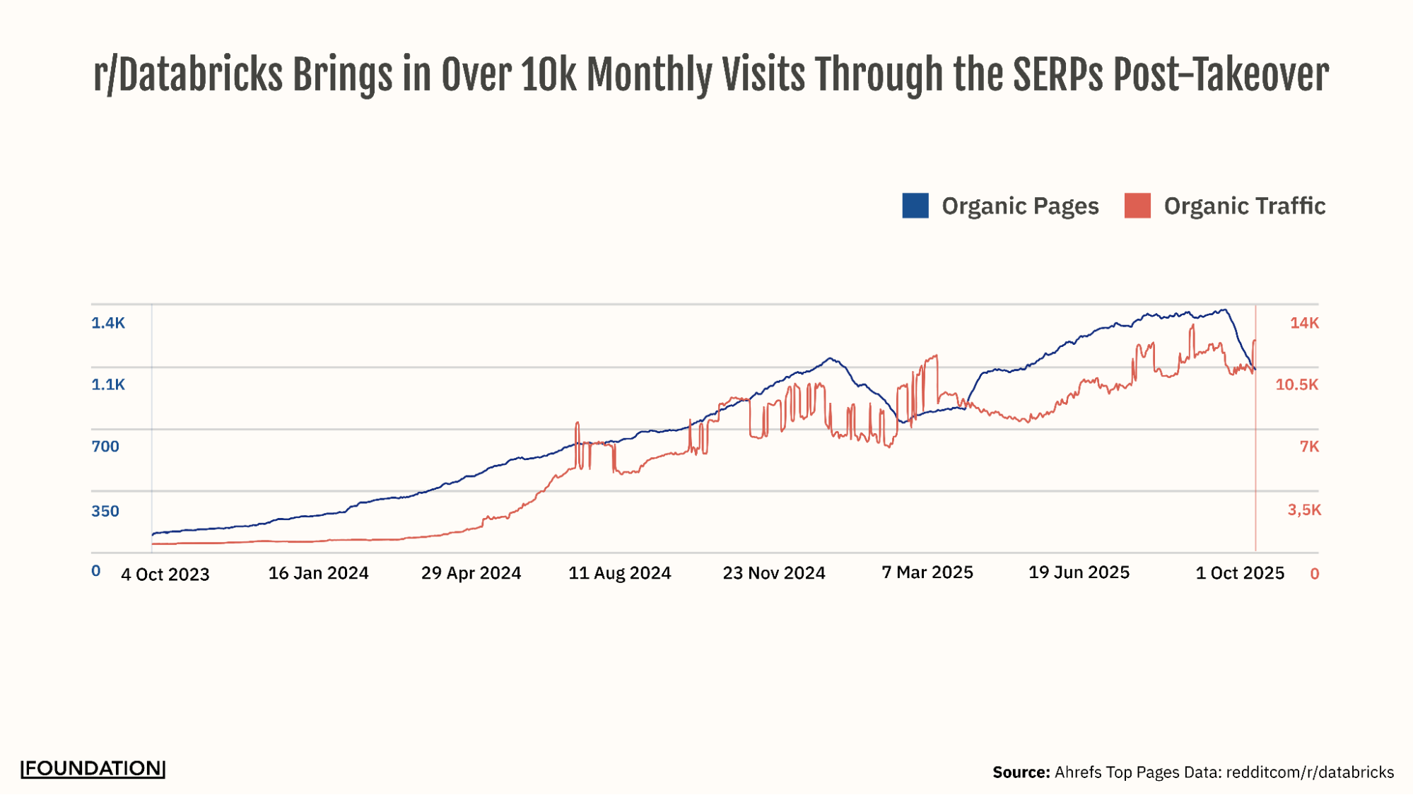 A lot of conversations surrounding Reddit center on its SERP dominance and impact on AI mentions and citations. And understandably so; r/databricks currently appears in a top-3 SERP position for over 300 keywords, resulting in more than 10,000 organic visits every month.