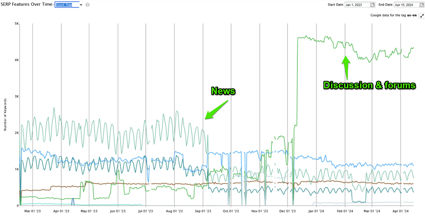 This spike showed a significant changing tide in SEO. In 2023, the vast majority of the content showing on the SERPs was news, but in December 2023, there was a significant shift as more discussion sites and forums started to appear.