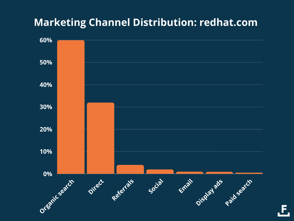 Organic traffic forms a crucial part of Red Hat’s overall marketing engine — 59% of Red Hat’s web traffic is organic, underscoring the effectiveness of their SEO and content strategies.