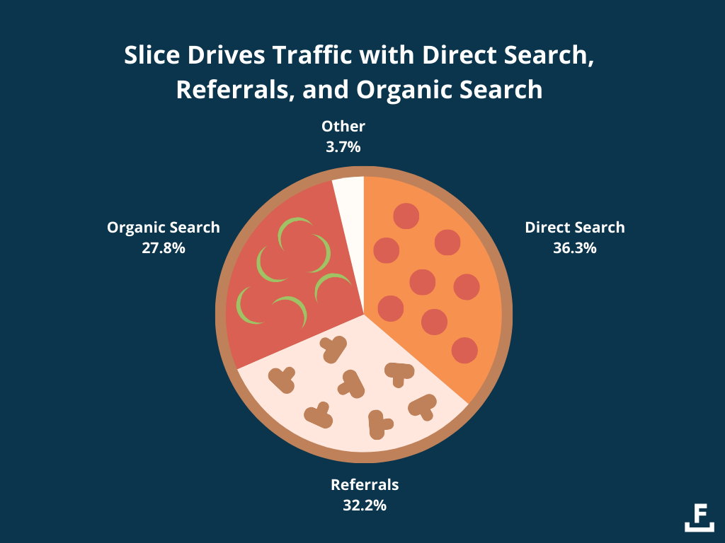 Visitors reach the Slice website through three main avenues: Direct search (36%), referrals (32%), and organic search (28%).